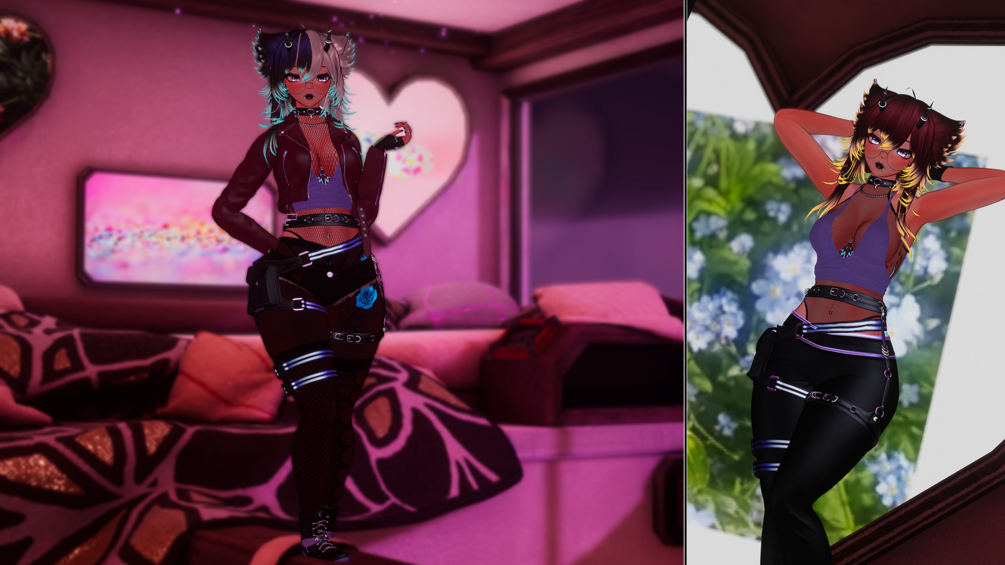 Head (edited by me) + Hair Texture: Cici | Body (edited by me): Zinpia | Face + Body Textures: YingYang | Shorts + Top + Ponytail + Front Hair + Icecream tongue: Flexuh | Gloves: floatharr | Ears + Tail: Nikkie | Jacket: queenanarya | Bodysuit + Panties: Loki | Top + Pants: DevilMK | Panties + Garters: miriaaam | Socks + Fishnets: Holoexe | Pasties: R3v0 | Shoes: mori | Choker: winks | Rings: yuuichivrc | Glasses: kasuallykhaotic | Icons: Smoluni | GoGo Loco: franada | Lollipop | VRCFT: adjerry91 | CGE: Hai