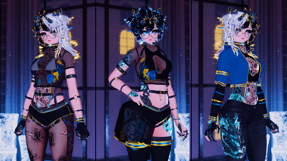 - Glasses | Earrings + Decos | Horns (Big+Small) | Harness (Waist + Top + Legs + Left / Right Arms) | Right - Left Hand Accessories | Claws | Necklace | Choker | Stomach Abs Nip Piercings | 3 Face Piercings | Body Cork