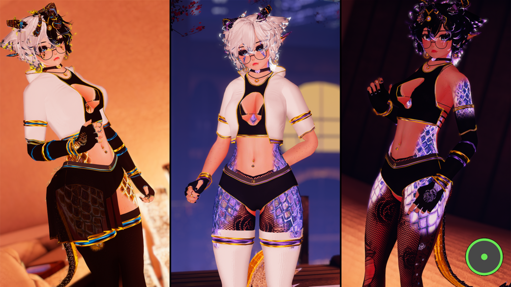 Head (edited by me) : Starlynn | Hair Texture: Cici | Body (edited by me): Zinpia | Body Textures: Honeylab | Hair: Saikura | Glasses: JinxieWinks | Tail: SriMango | Harness+Underwear: Tilly | Shoes: Plaz | Eyes: Ryuohh | Ears: Apyr | Bodysuit: Loki | Top: 1Ember | Rings: yuuichivrc | GoGo Loco: franada | Wholesome | VRCFT: adjerry91 | CGE: Hai